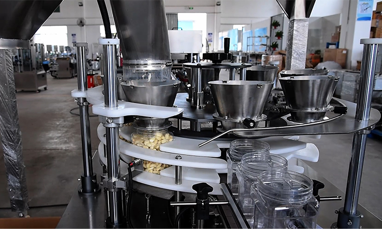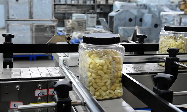 称重完成后,大蒜被送至双通转盘接料机。,由于罐型1KG加大,该设备的接料速度20-30次/分钟(以1kg为准),其接料斗与挂套均采用镀硅胶设计,进一步保障了大蒜的完整性。同时,接料机还具备瓶底震动功能,有效防止物料蓬松溢出,确保生产过程的顺畅。此外,双通转盘接料机的进瓶端输送线加长2米,出料输送和旋盖机输送共用输送动力,大大提高了生产效率。