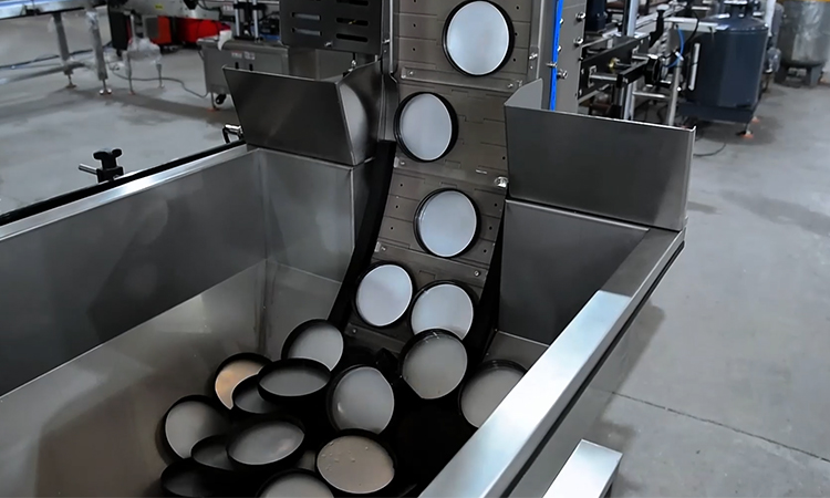 随后,装填好的大蒜瓶进入八轮旋盖机进行封盖处理。该设备的刮盖前后各增加了1米输送带,为液氮加注机和铝箔封口机的操作提供了便利。输送带的高度和宽度与高速接料机相匹配,确保了整个生产线的连贯性。此外,提升机理盖料仓部分及输送带面向旋盖设备,为液氮加注机提供了理想的放置位置。