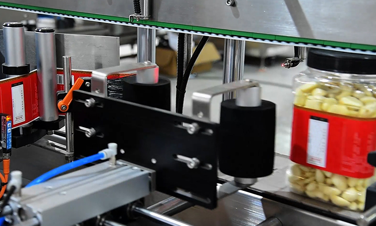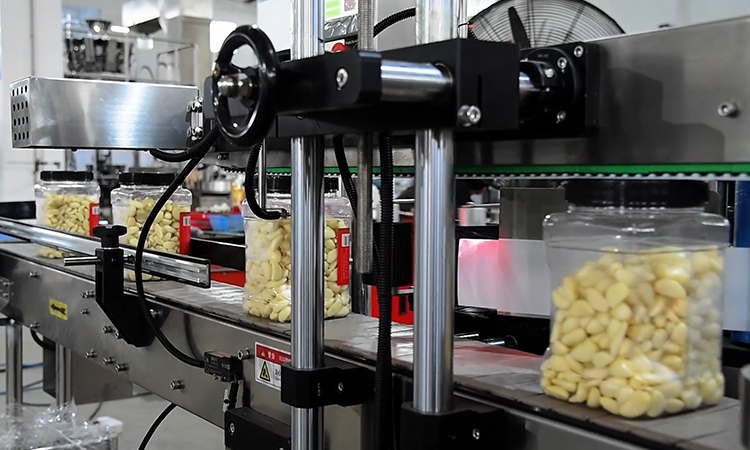 最后,成品大蒜瓶进入全自动贴标机进行贴标处理。该设备采用定制毛刷,能够精准地贴在方瓶的三个面上,适用产品范围广泛,贴标速度可达40-60瓶/分钟。其输送带高度与铝箔封口机匹配,确保了生产线的整体协调性。此外,该设备还具备色带打码功能,能够满足不同客户的需求。