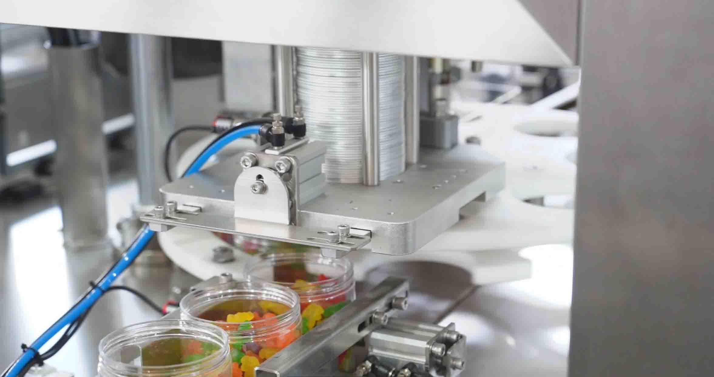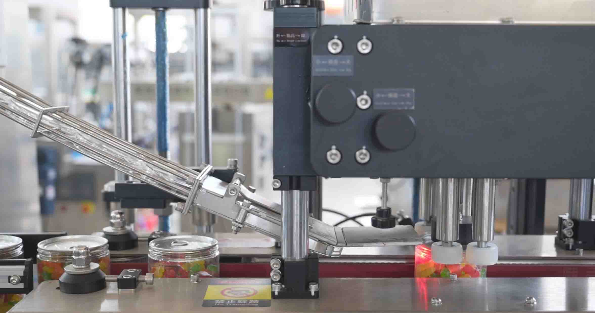 在密封环节,生产线上演 “高效四连击”—— 封罐、上盖、伺服旋盖、铝箔电磁封口依次完成,瞬间实现罐身密封。这套流程不仅速度快,还能最大程度保证包装的稳定性和安全性,避免运输过程中出现漏糖、受潮等问题。