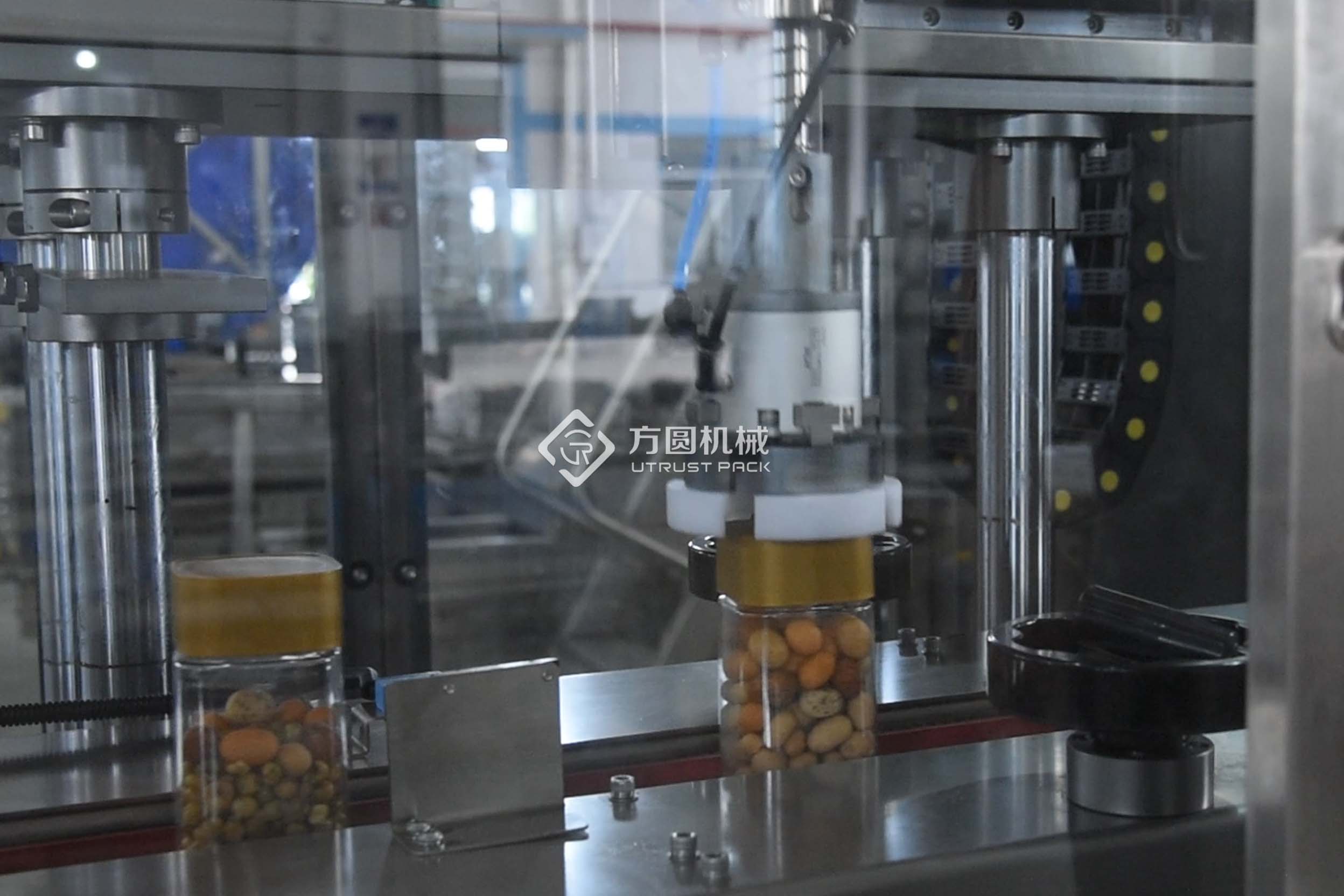 坚果的新鲜度,全靠“封印”得够严实。灌装完成后,罐子立马被输送到伺服跟随式旋盖机处,3轴机械臂如同“温柔的大手”,精准且轻柔地抓住瓶盖并完成旋紧操作。