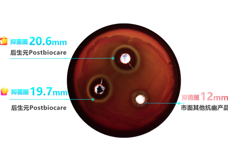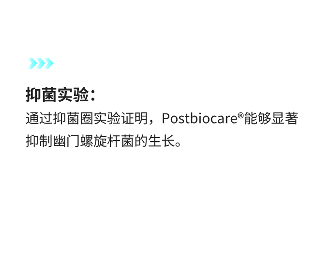 后生元Postbiocare主要是由多种专利益生菌复合发酵,提取纯化浓缩而成。 通过抑制/吸附幽门螺旋杆菌实验发现:石英晶体微天平(QCM)证明,后生元Postbiocare能够快速的识别并结合幽门螺旋杆菌,抑制幽门螺旋杆菌的增殖生长,而且具有高度靶向性,能够特异性结合幽门螺旋杆菌,形成聚合体后通过消化道排出体外,有效缓解幽门螺旋杆菌引发的反酸、胃食管反流等现象。